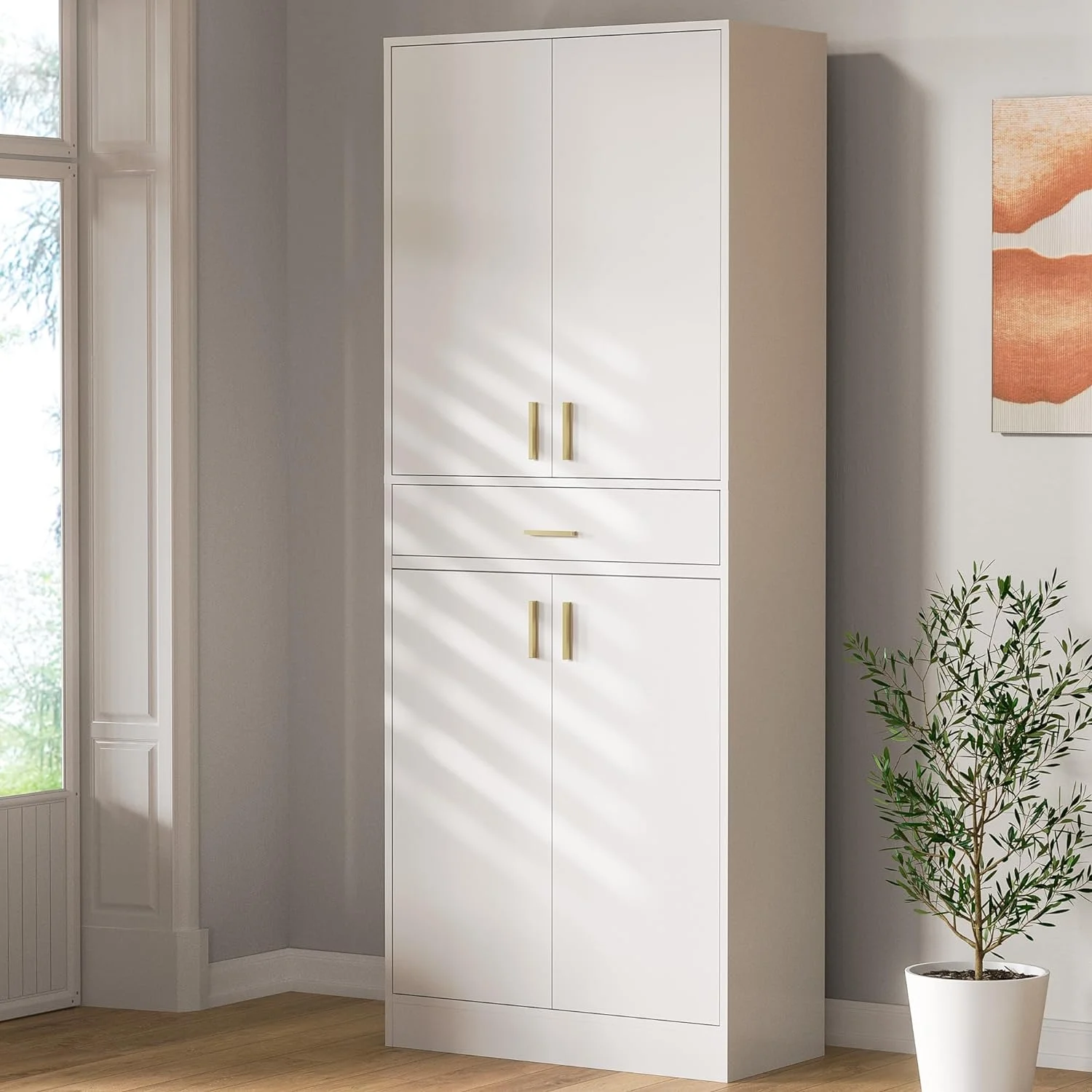 KEMANHUAN Kitchen Pantry Storage Cabinet 71" Tall 4 Doors Wood Freestanding Cupboard with Sliding Drawer and 2 Adjustable Shelves for Dining Room Living Room, Laundry, Bathroom, White