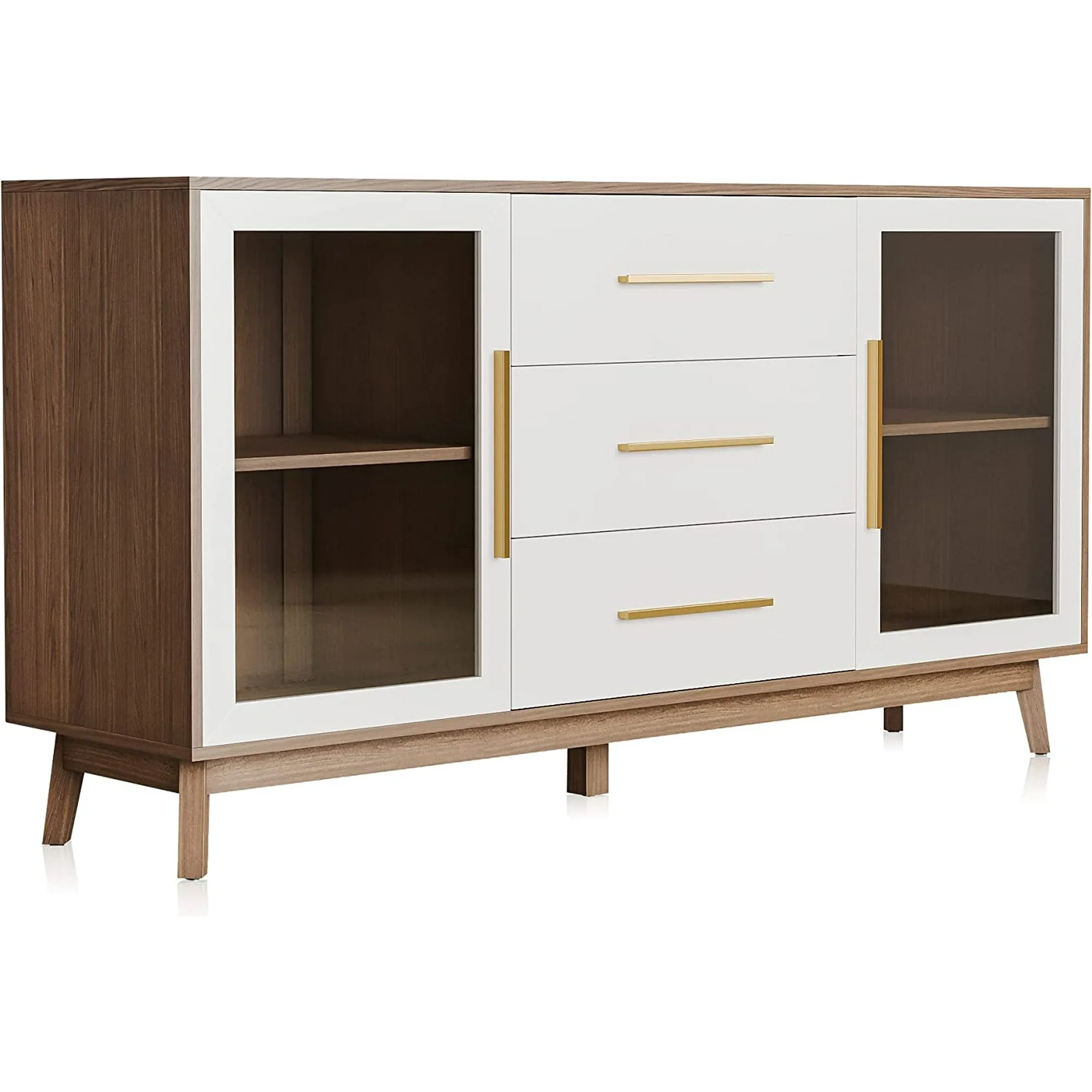 KEMANHUAN Sideboard Buffet Cabinet with 3 Drawers & 2 Doors, Console Table for Kitchen Glass Storage Cabinet Coffee Bar Accent Cabinet for Living Room Dining Room Hallway, White