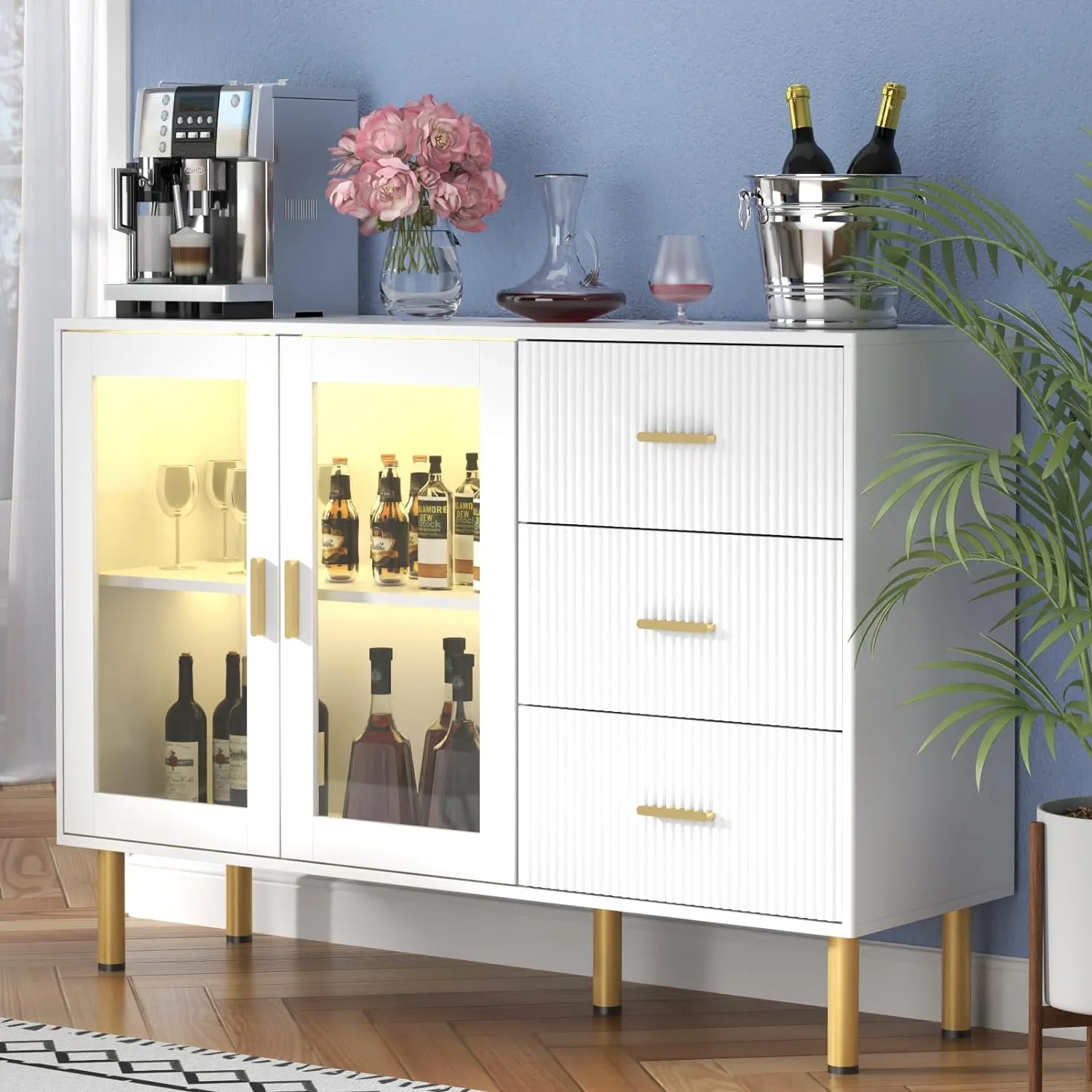 KEMANHUAN Wine Bar Cabinet with LED Light, Home Coffee Bar Cabinet with Glass Doors and 3 Drawers, Sideboard Buffet Cabinet with Storage, Liquor Cabinet for Dining Room, Living Room, Kitchen (White)