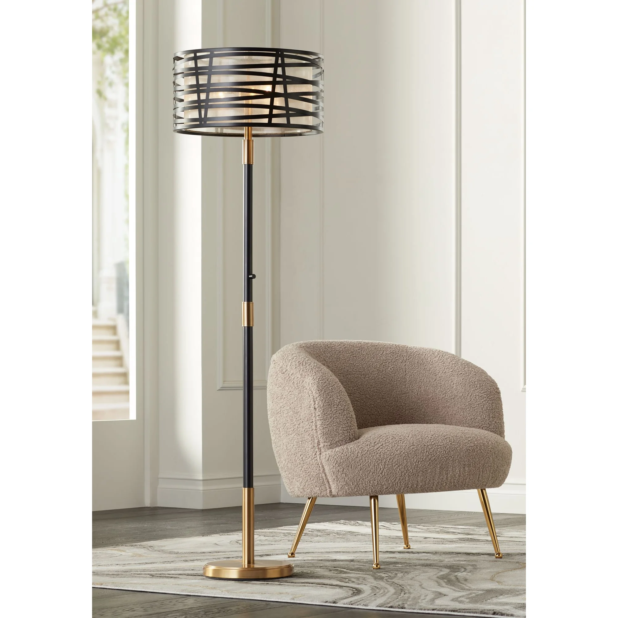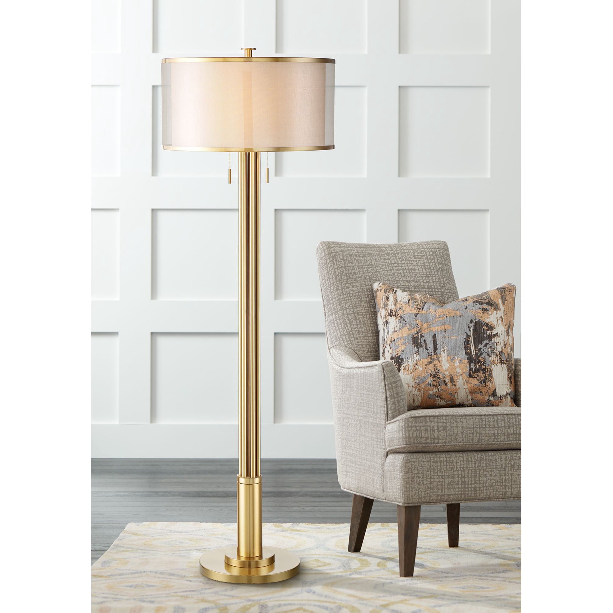 Possini Euro Design Granview Modern Floor Lamp 70 1/2" Tall Brass Metal Sheer Organza Outer Linen Inner Drum Shade for Living Room Bedroom Office Home
