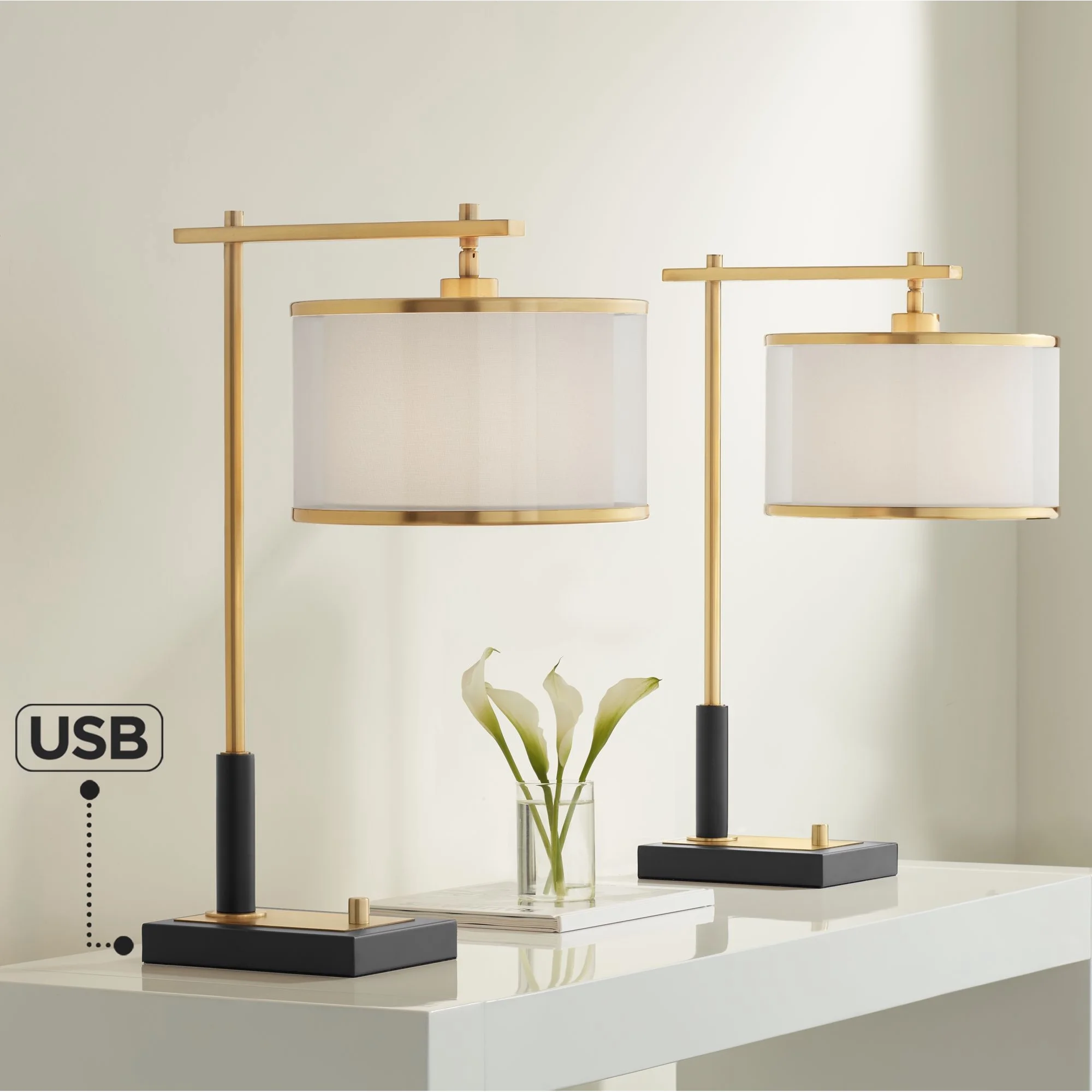Possini Euro Design Hayven 23 1/2" High Small Mid Century Modern Desk Lamps Set of 2 Dual USB Ports Black Gold Metal Charging