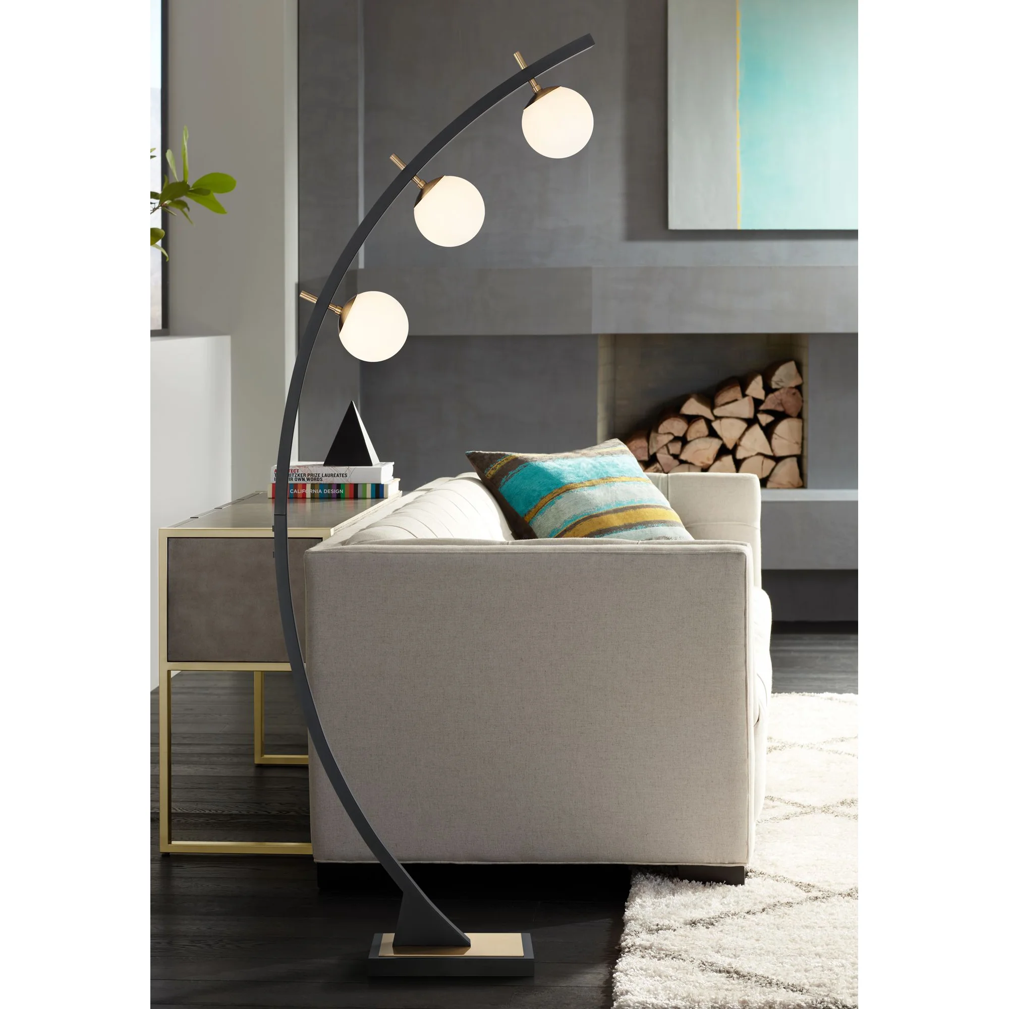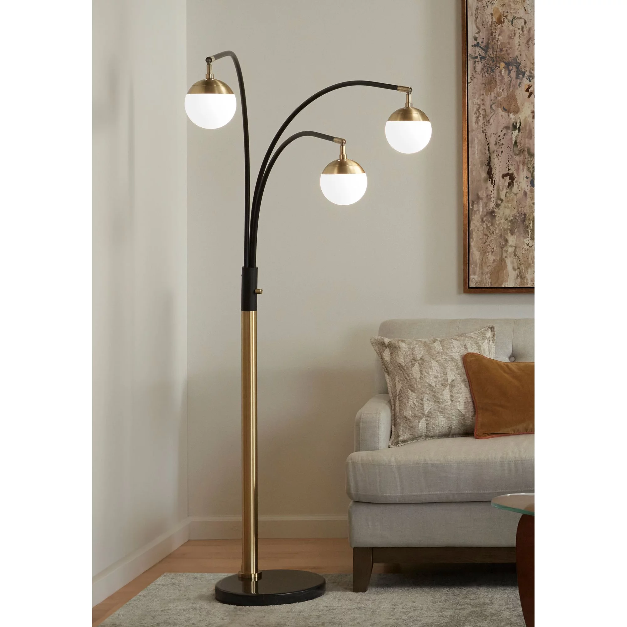 Possini Euro Design Rialto Modern Arched Floor Lamp 68 1/4" Tall Warm Gold Matte Black 3 Light Frosted White Glass Orb Shade for Living Room Reading