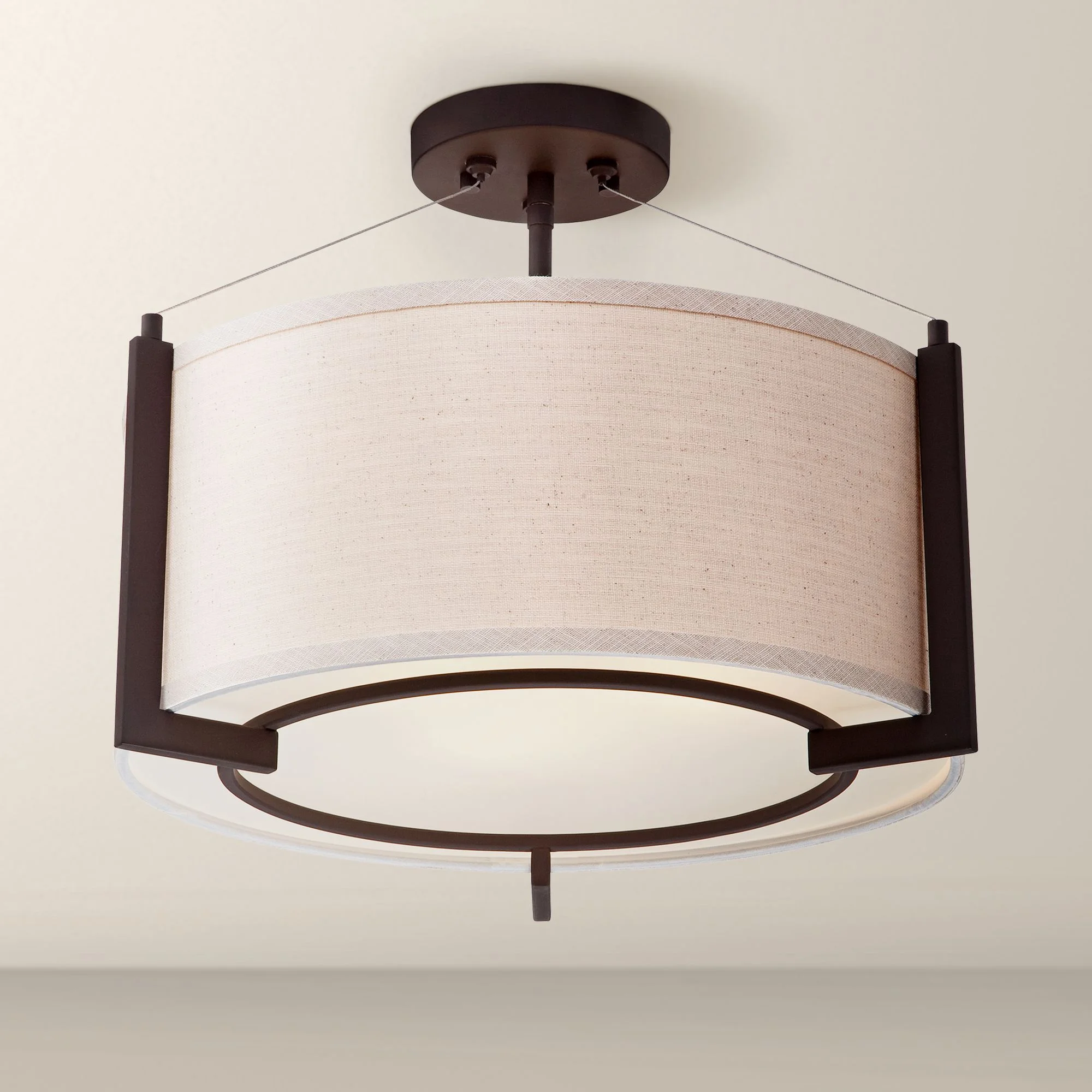 Possini Euro Design Stinson Modern Ceiling Light Semi Flush Mount Fixture 17 1/4" Wide Bronze 3-Light Linen Drum Shade for Bedroom Kitchen Living Room