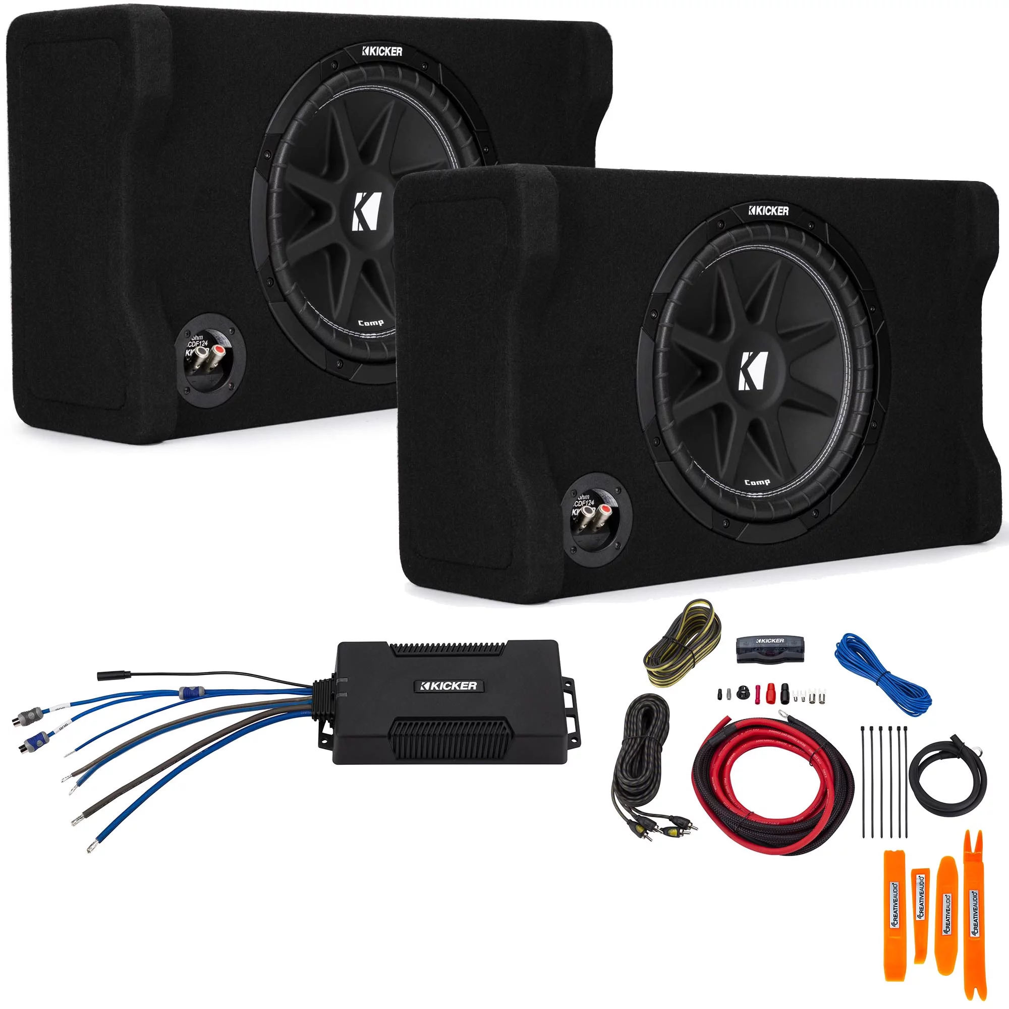 Kicker 48CDF124 Comp (2) 12" Subwoofer in Down Firing enclosure with PXA8001 Small Chassis Amplifier and wire kit