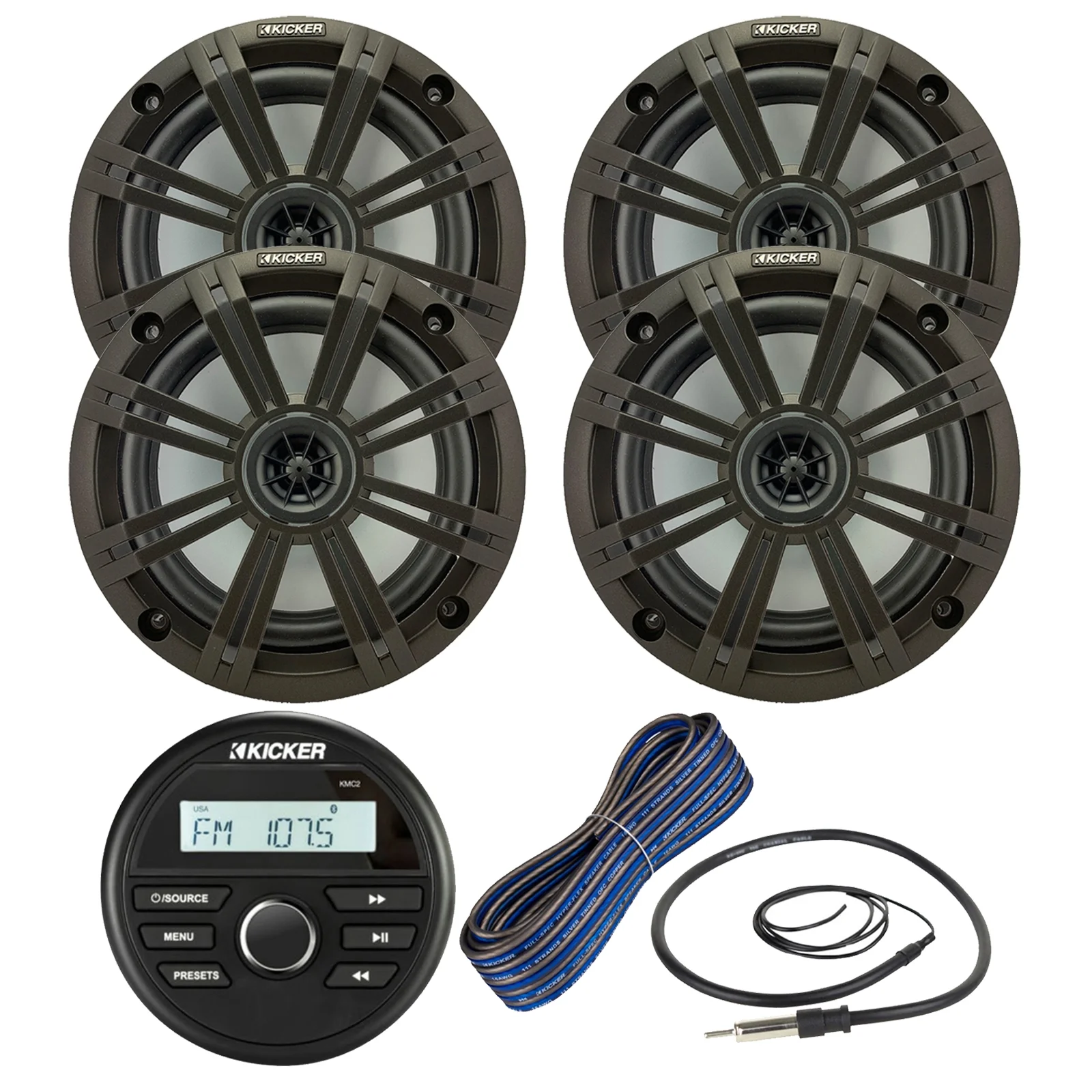 Kicker All-Weather Marine Gauge Style Bluetooth USB Stereo Receiver Bundle Combo with 2 Pair (QTY 4) 6.5" 2-Way 195W Max Coaxial Marine Speakers w/ Charcoal Grilles, 50-Ft 16-Gauge Wire, 22" Antenna