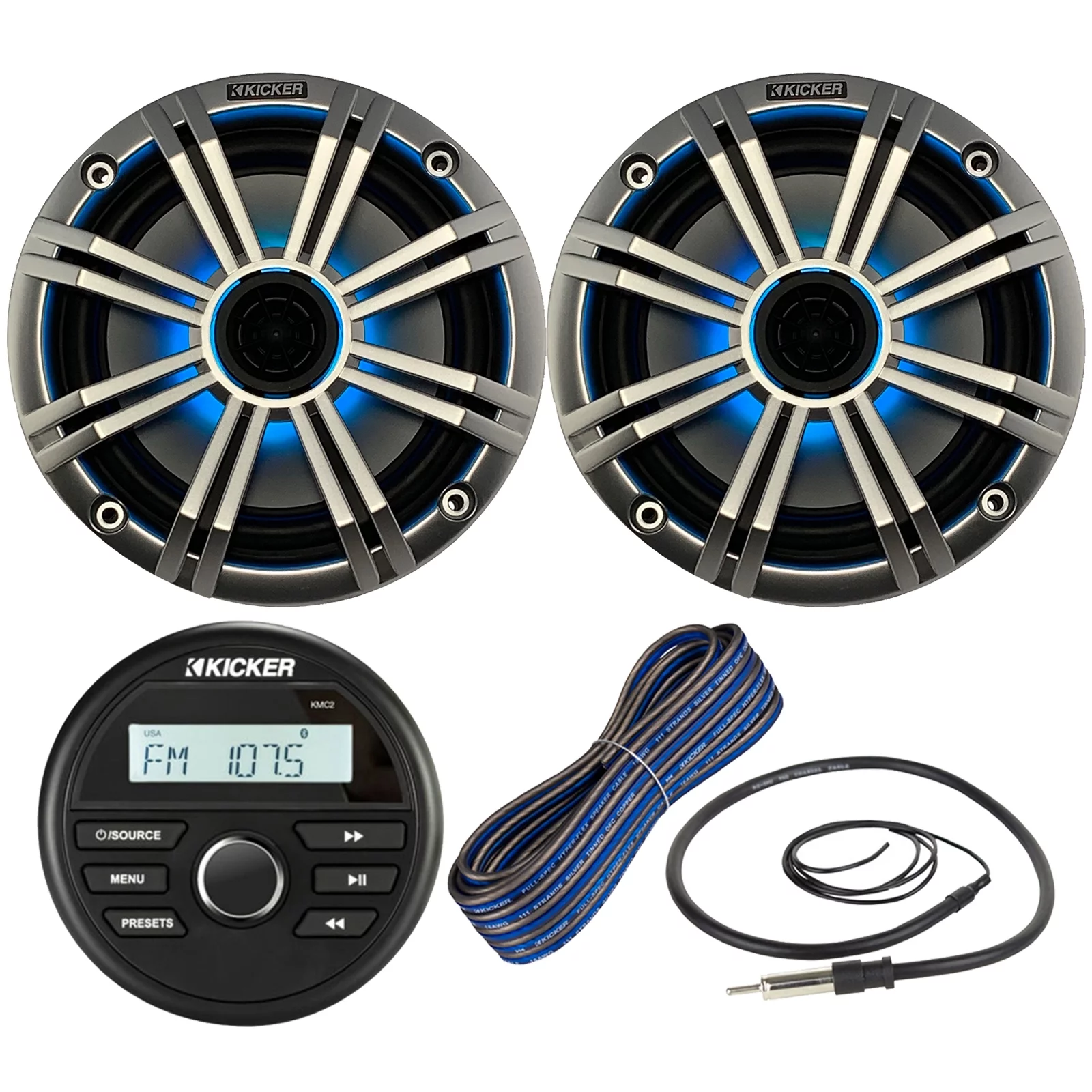 Kicker All-Weather Marine Gauge Style Bluetooth USB Stereo Receiver Bundle Combo with (QTY 2) 6.5" 2-Way 195W Max Coaxial Marine LED Speakers w/ Silver Grilles, 16-Gauge Wire, 22" Antenna