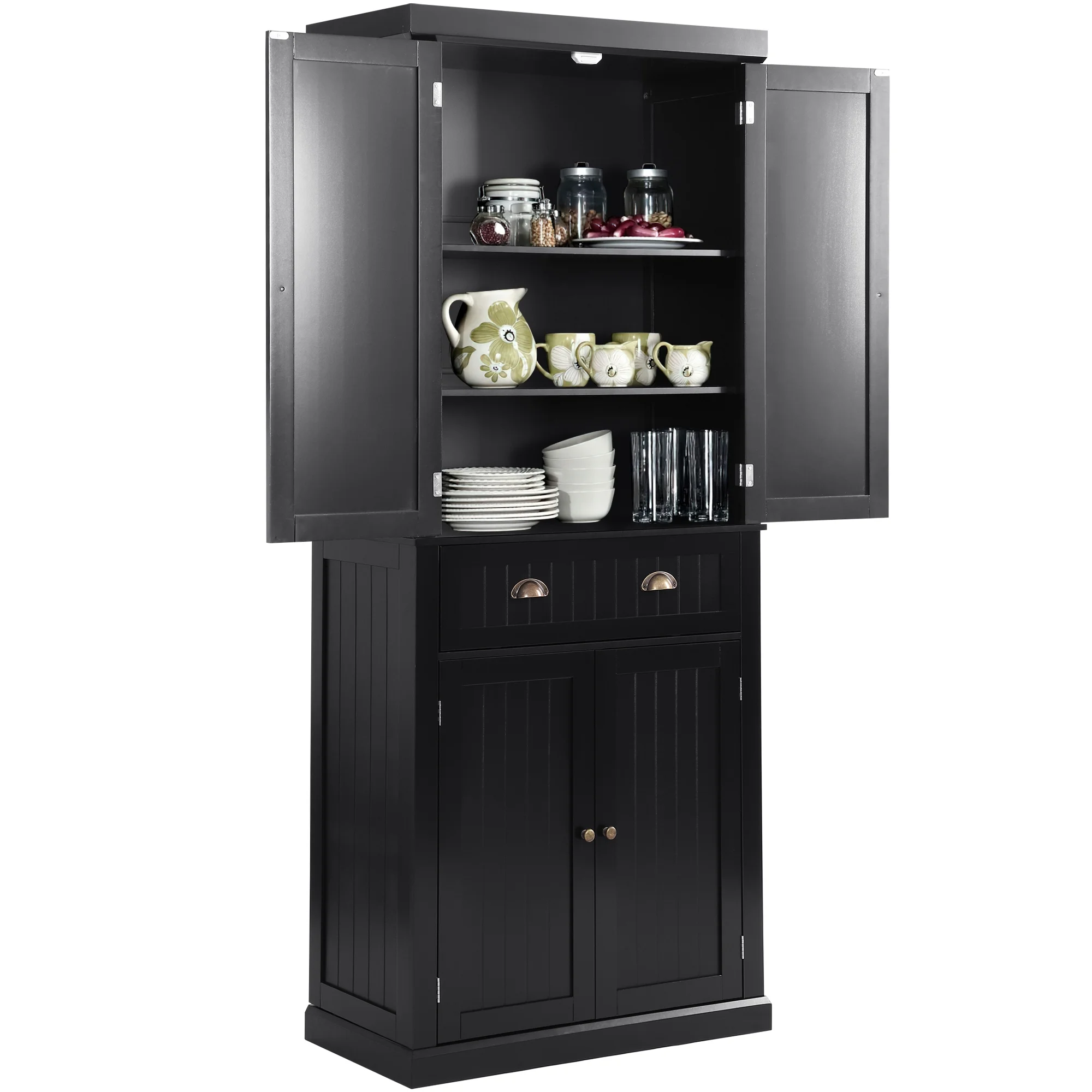 KIGOTY 72'' H Tall Kitchen Pantry with 4 Doors ,A Large Drawer Freestanding Pantry Cupboard Black Storage Cabinet for Dining Room ,Office