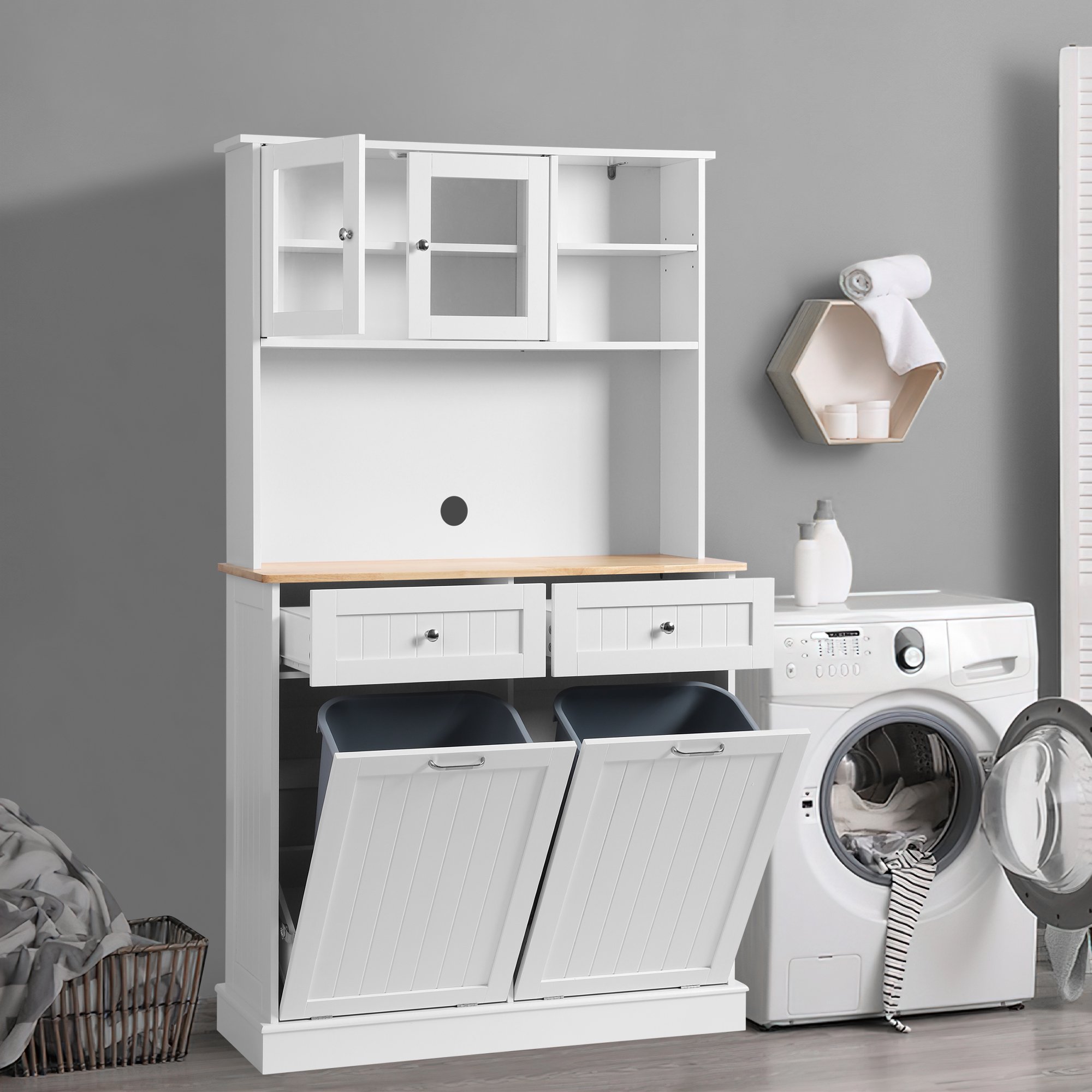 KIGOTY Kitchen Trash Cabinet, Double Tilt Out Trash Can Cabinet with Countertop and Drawer, Free-Standing Pet Proof Recycling Cabinet Garbage Can Holder (67"H,Black)