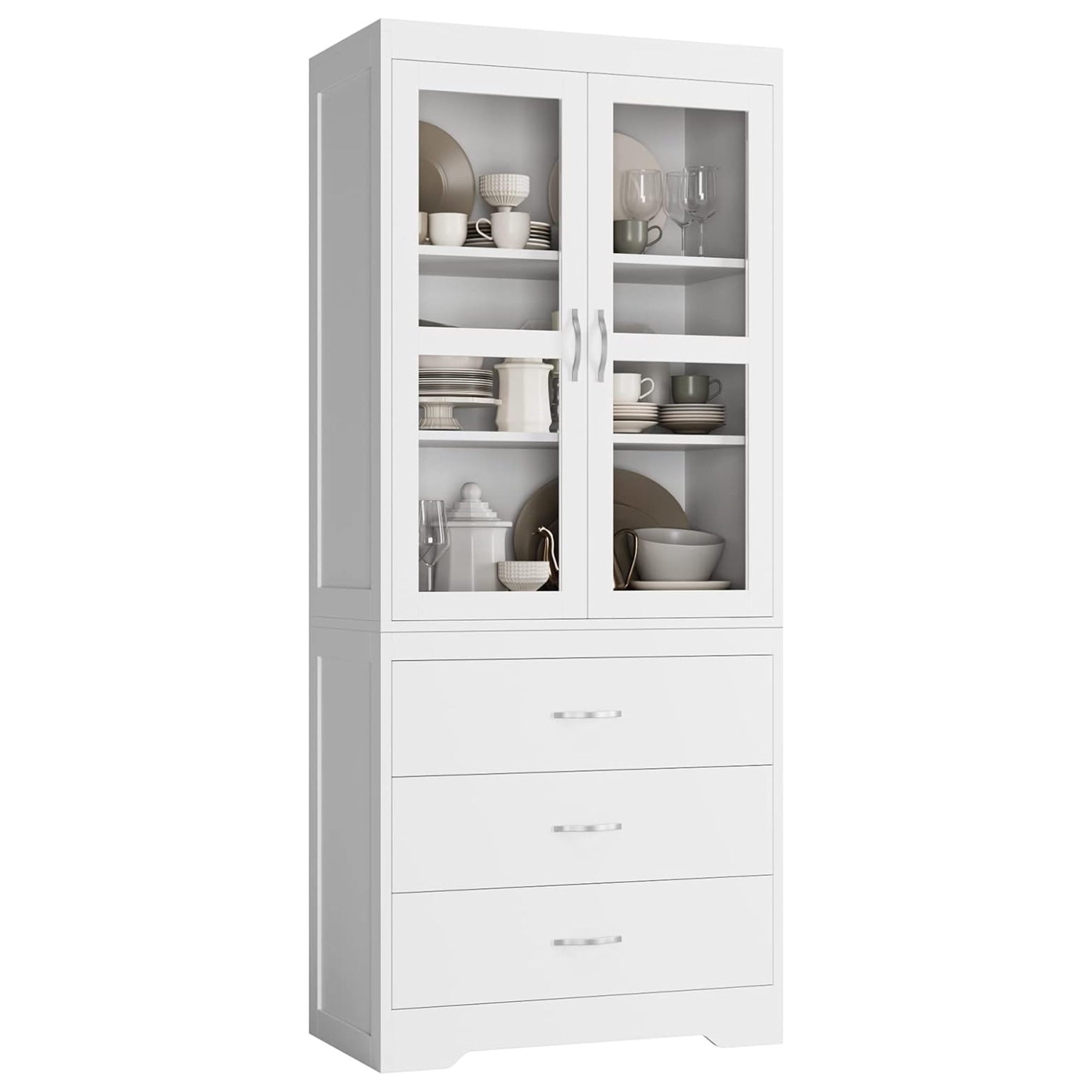 Killeryuki White Kitchen Pantry Cabinet, 67 Freestanding Tall Storage Cabinet with 2 Tempered Glass Doors, Modern Kitchen Cupboard Large Floor Cabinet with 3 Shelves & 3 Drawers for Home Office