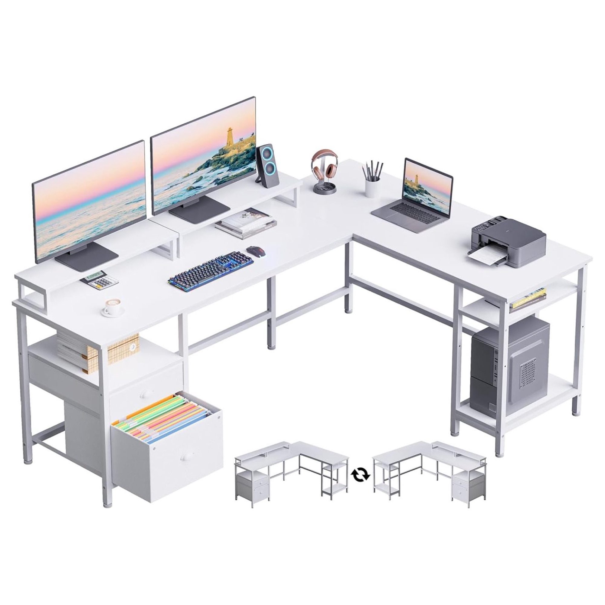 Killeryuki White 66" L Shaped Desk with Shelves, Reversible Corner Computer Desk with File Drawer & Dual Monitor Stand, Large Home Office Desk Writing Study Gaming Table Workstation