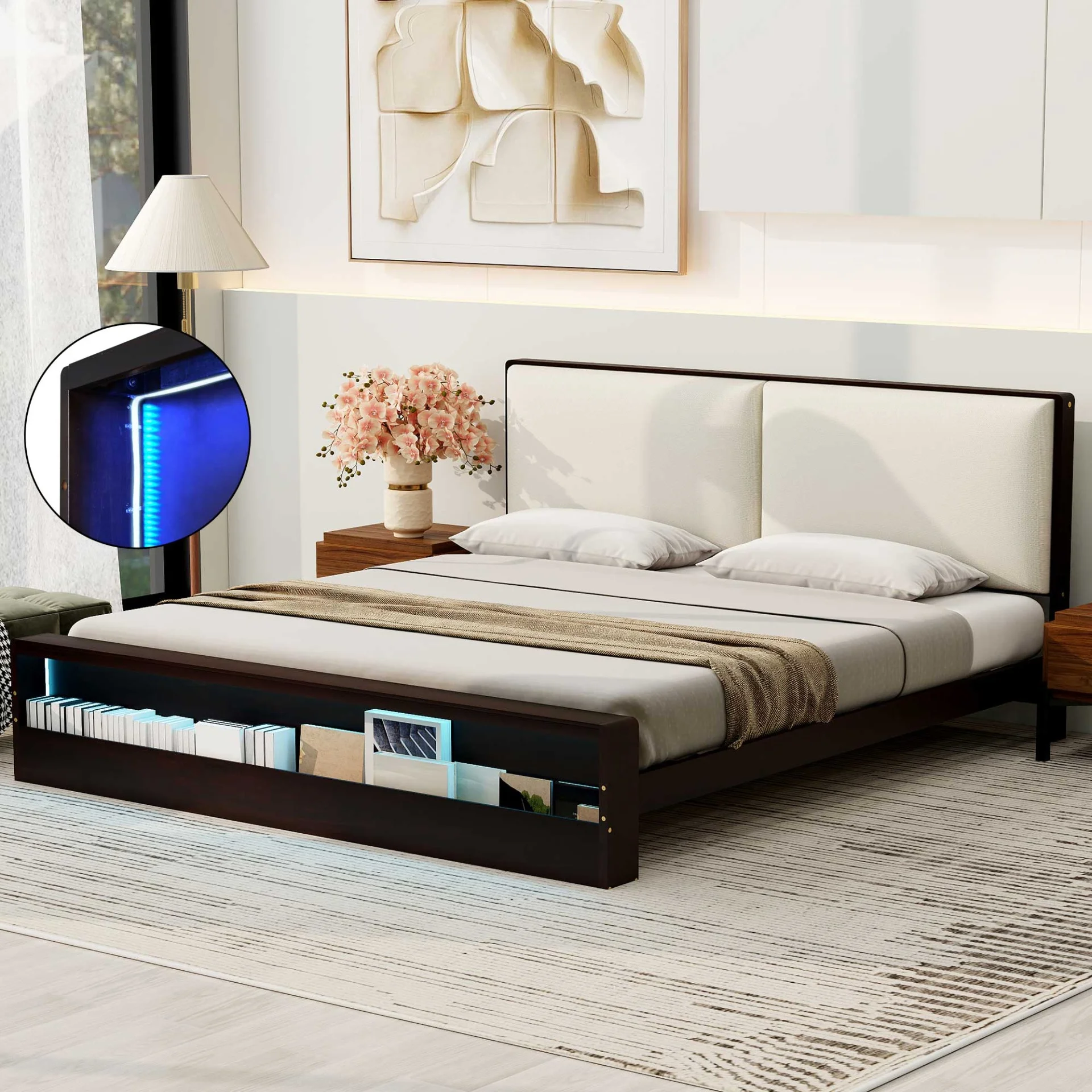 King Size Wood Platform Bed with Upholstered Headboard and Built-in Book Shelf Footboard Design and LED Light Strips, No Box Spring Needed, Espresso