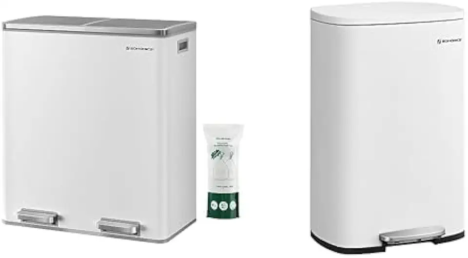 SONGMICS 2 x 8-Gallon Garbage Can for Kitchen White and Gray & SONGMICS 13 Gallon Step-On Kitchen Trash Can, Soft Close Waste Bin White ULTB60WT and ULTB050W01