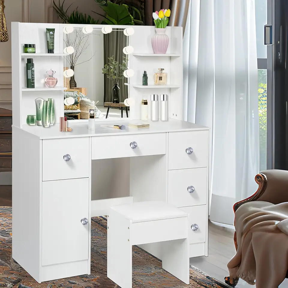 White Vanity Desk with Mirror and 10 Lights, 3 Colors Adjustable Brightness Makeup Mirror with Lights, 5 Storage Drawers & Side Cabinet Vanity Table Dressing Stool for Bedroom, Diamond Handles