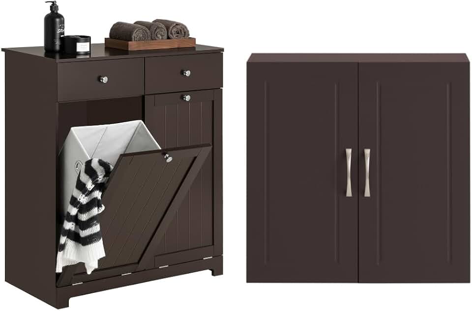 Haotian Laundry Hamper Cabinet with 2 Drawers and Wall Cabinet, BZR33-BR+FRG231-BR