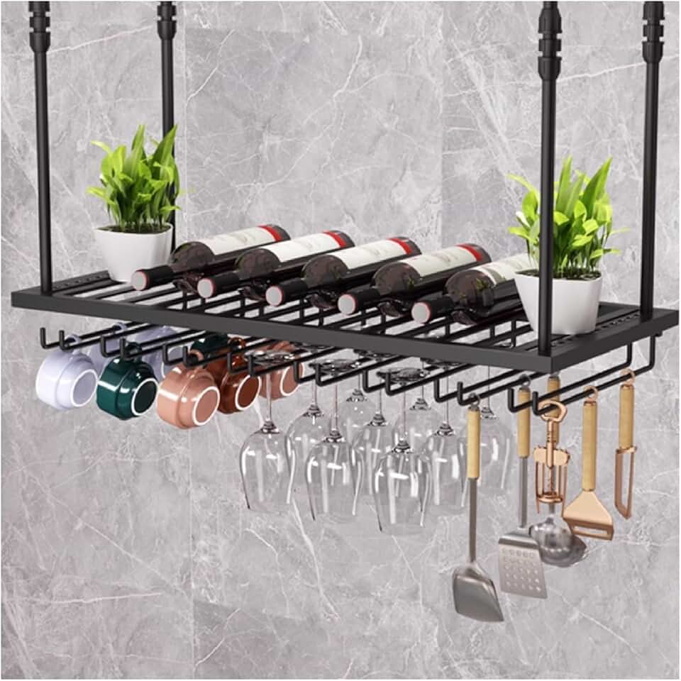 Hanging Wine Rack with Glass Holder, Adjustable Hanging Bar Wine Glass Rack Ceiling Bottle Holder Wine Shelf Shelves Perfect for Bar Kitche