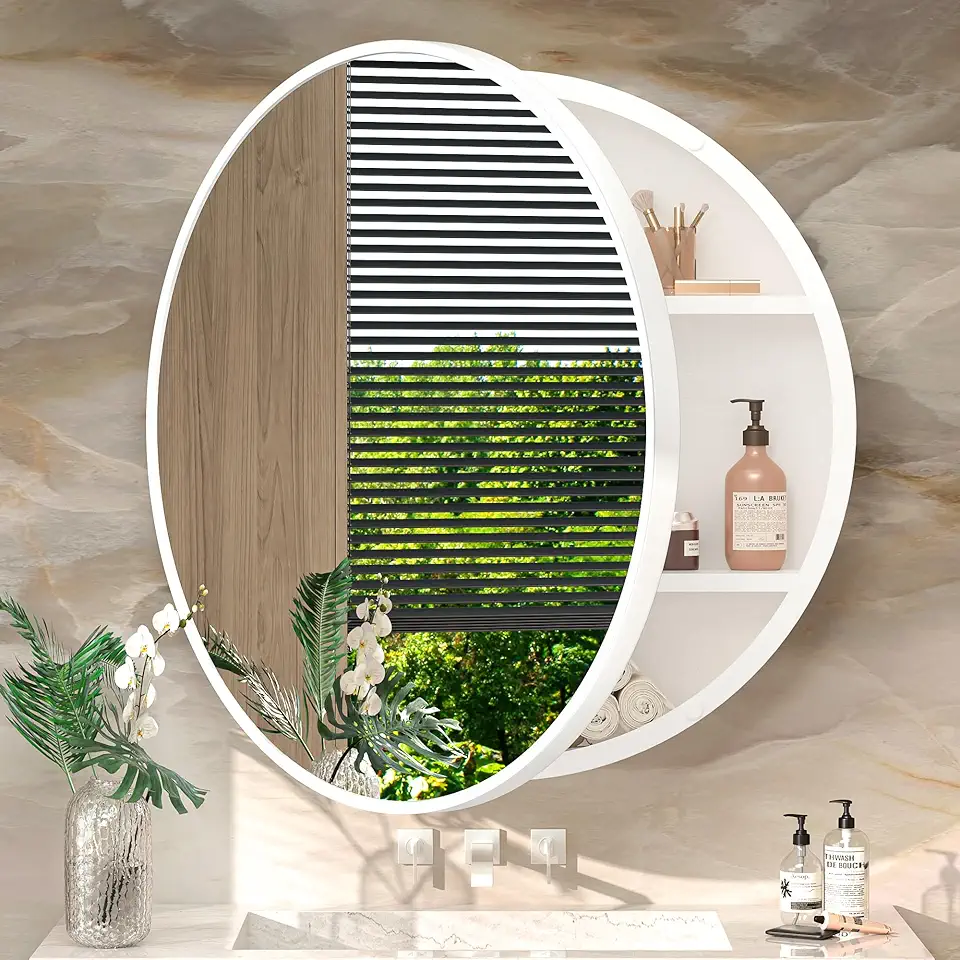 TokeShimi Medicine Cabinet, 26 Inch Round, White, Wall Mount, Modern Farmhouse Style, Metal, Customizable Storage, Surface Mount Only