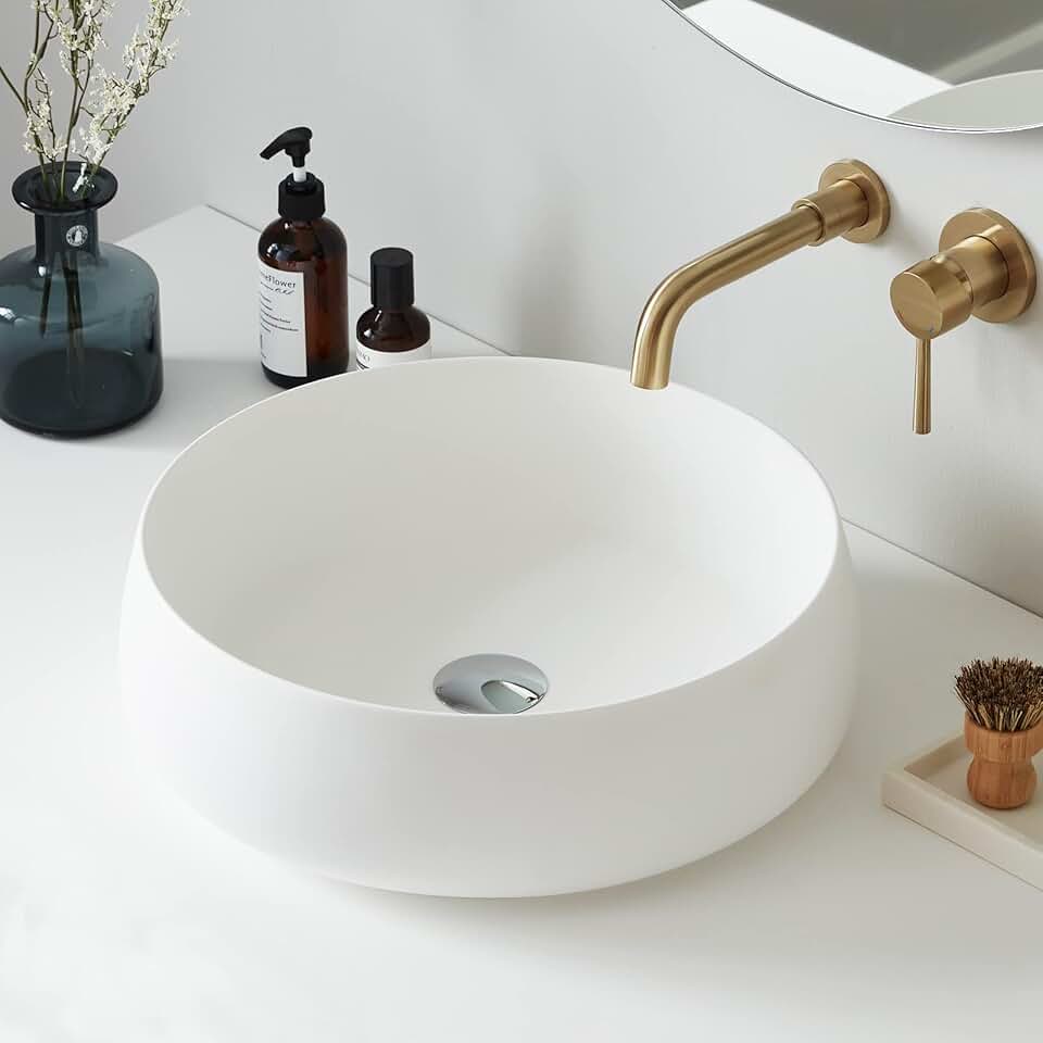 Bathroom Sink Matte White Stone Resin 17.7'' Round Bathroom Vessel Sink, Above Counter Vessel Sink Basin with Pop-up Drain (White)