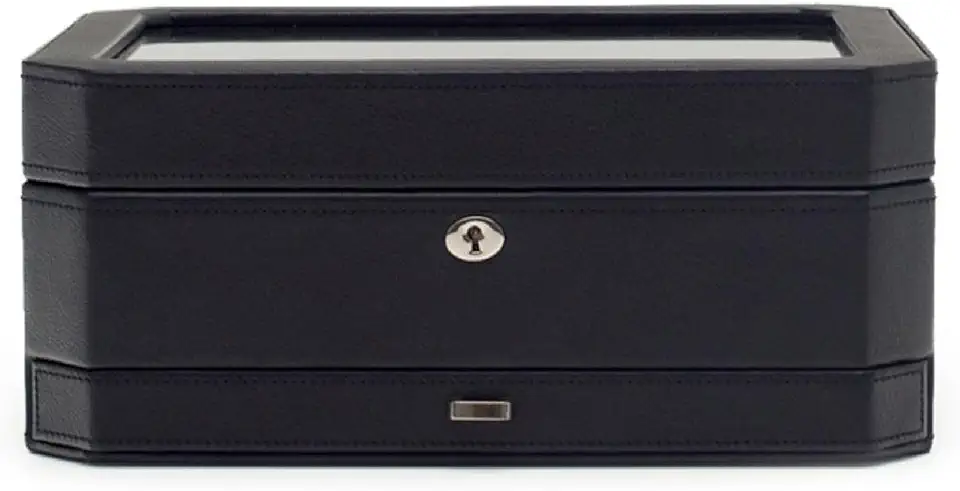 WOLF Windsor 10-Piece Watch Box with Drawer, Black - Features 10 Watch Compartments, Eight Ring Rolls & 17 Jewelry Compartments - Vegan Leather Exterior