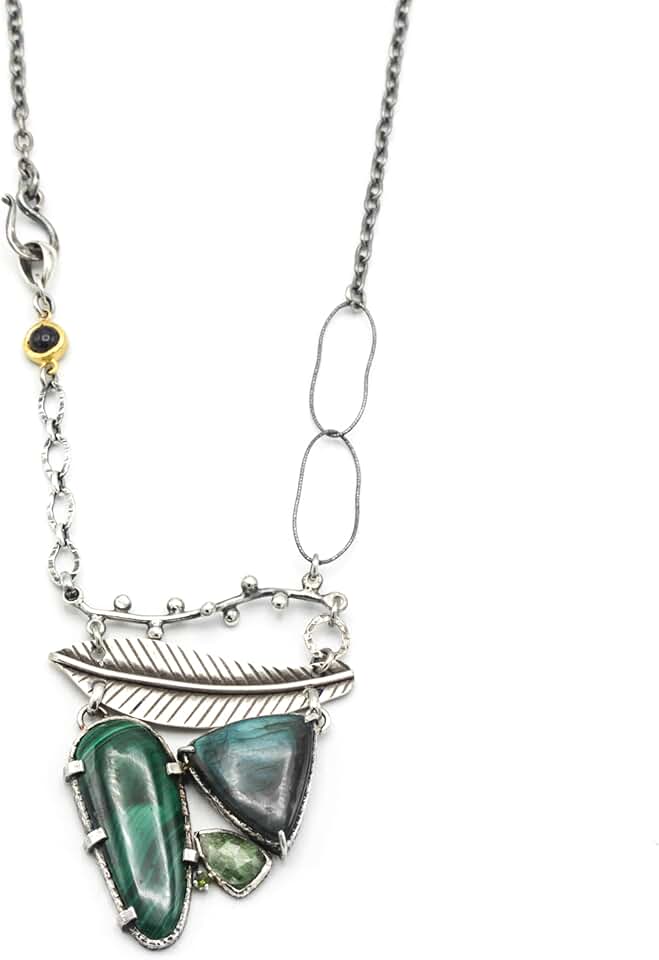 Malachite pendant necklace and silver leaf with Labradorite and kyanite gemstone secondary on sterling silver oxidized chain