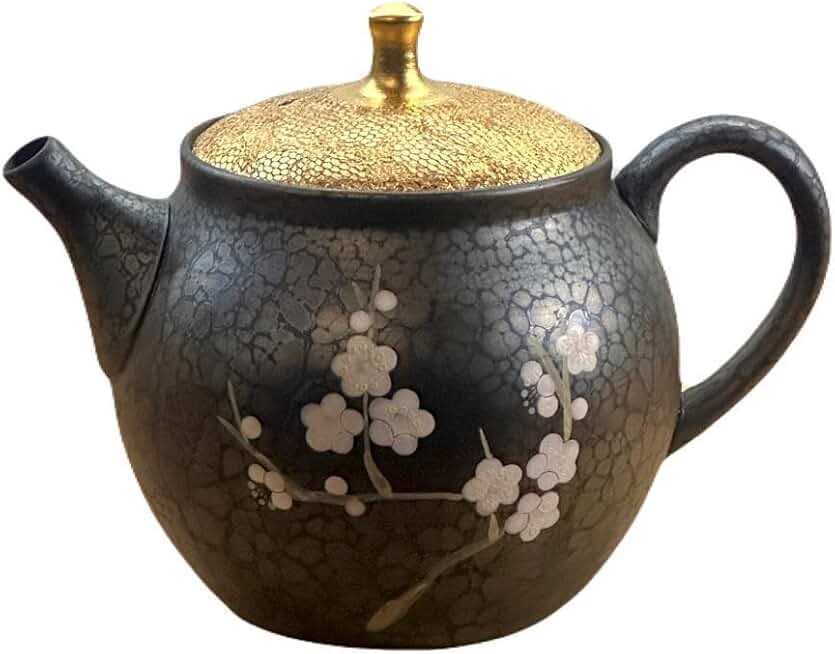 Shoryu Teapot with Tenmoku Glazed Gold Lid White Plum Pattern