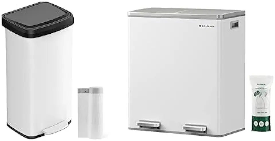 SONGMICS 18-Gallon Kitchen Trash Can, with Stay-Open Lid, Step-on Pedal, Large and Space-Saving, White ULTB520W68 & 2 x 8-Gallon Dual Garbage Can for Kitchen, with 15 Trash Bags, White ULTB60WT02