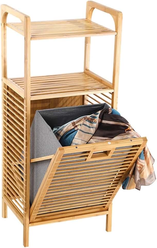 2-Tier Shelves and Tilt Out Basket, Bamboo Freestanding Clothes Basket W/Shelf & Removable Liner, Laundry Hamper, for Laundry Room, Bathroom, Bedroom, Guest Room, Closet
