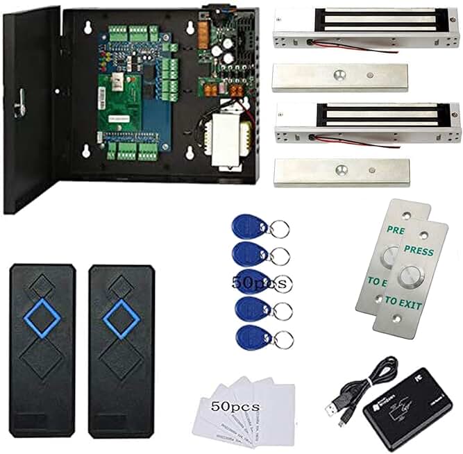 2 Door Access Control Panel System Kits with 600lbs Waterproof Magnetic Lock RFID Reader Metal Weatherproof Exit Button 110V Power Supply Box USB Reader RFID Card Key Fob Phone APP Remotely Open Door