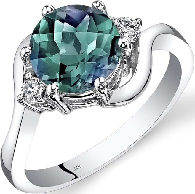 PEORA Created Alexandrite and Genuine Diamond Ring for Women 14K White Gold, Bypass Solitaire Design, 2.25 Carats Round Shape 8mm, Size 7