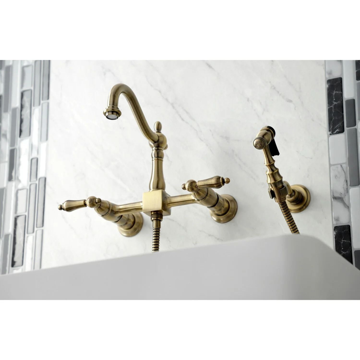Kingston Brass Heritage Wall Mount Bridge Kitchen Faucet with Brass Sprayer, Antique Brass