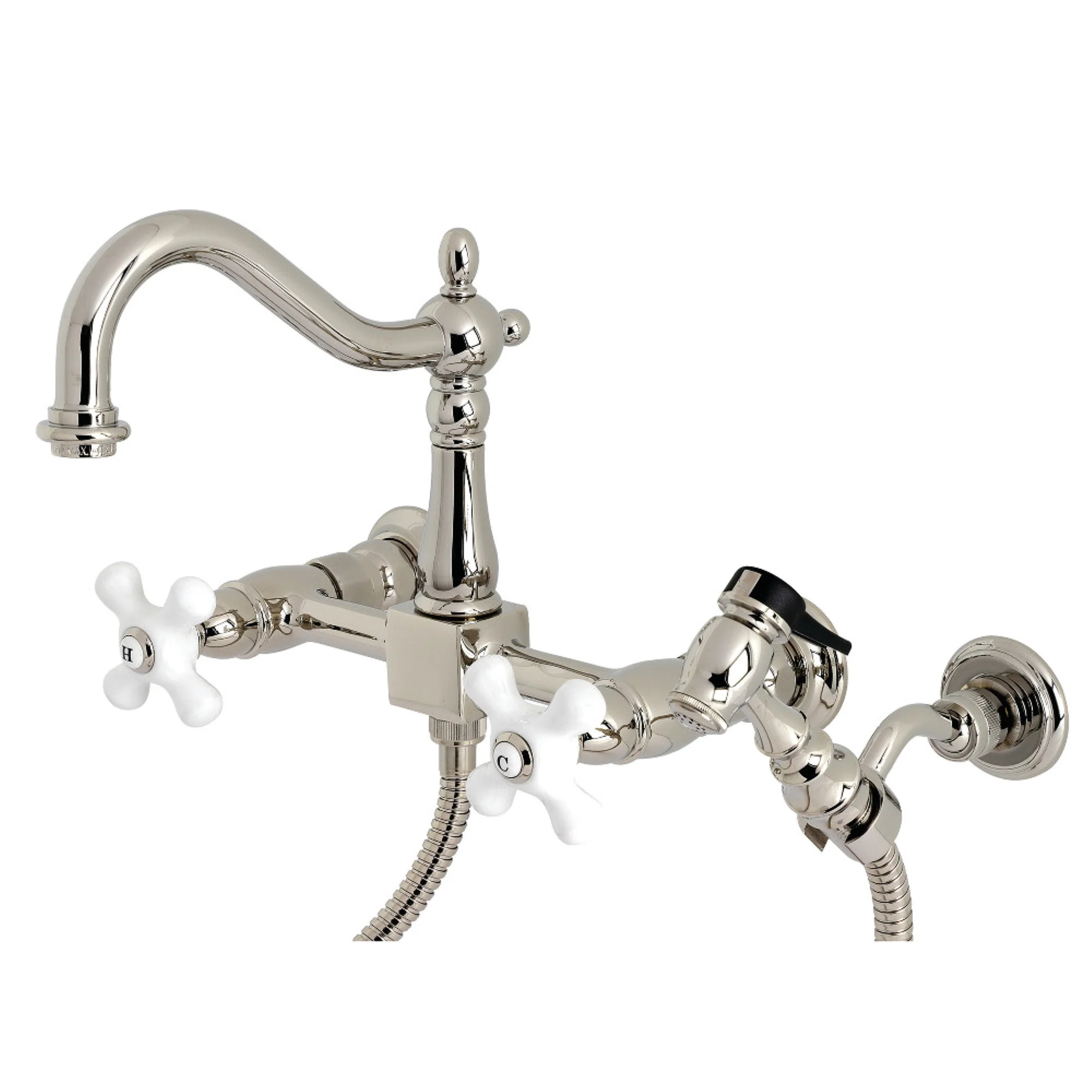 Kingston Brass Heritage Wall Mount Bridge Kitchen Faucet with Brass Sprayer, Polished Nickel