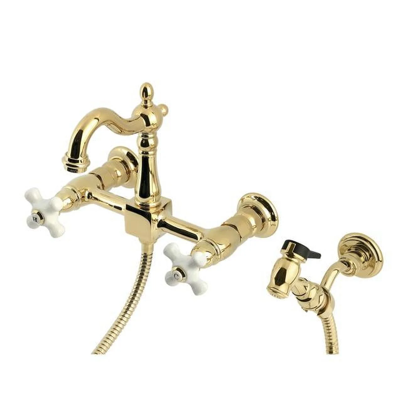 Kingston Brass Heritage Wall Mount Bridge Kitchen Faucet with Brass Sprayer, Polished Brass