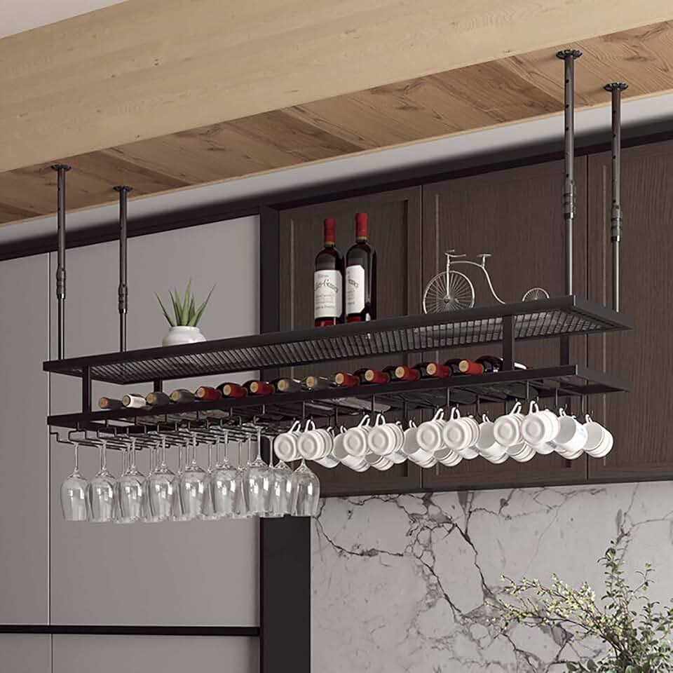 Vintage Style Industrial Ceiling Mount Shelf 2 Layer With Wine Bottle Glass Rack, Modern Ceiling Mounted Metal Wine Shelf Holder For Bar Cafe Kitchen For Commercial Restaurants Pantry Bar Wine Cellar(