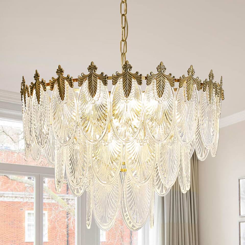DLLT 24'' Gold Crystal Chandelier, 9 Light Modern Round Chandeliers, 3 Tiers Crystal Pendant Lighting Fixtures for Bedroom, Dining Room, Living Room, Adjustable Height, 3000k E12 Bulbs Included, UL