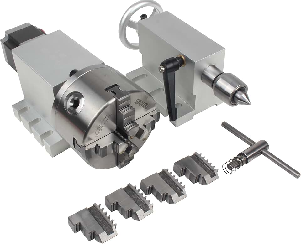 Engraving Machine Rotary 4th Axis,CNC Router Rotation Fourth A-axis 4 Jaw K12-100mm Chuck Dividing Head,Gapless Harmonic Gearbox Reducing Ratio 100:1 w/ 65mm Tailstock Nema23 Motor