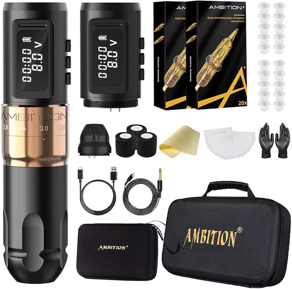 Tattoo Kit - Ambition Mars-U Wireless Tattoo Machine Kit with Adjustable Stroke 1800mAh Power with 40pcs Tattoo Cartridges Needles Ink Cup Gloves Bandage Practice Skin for Professional Tattoo Artists