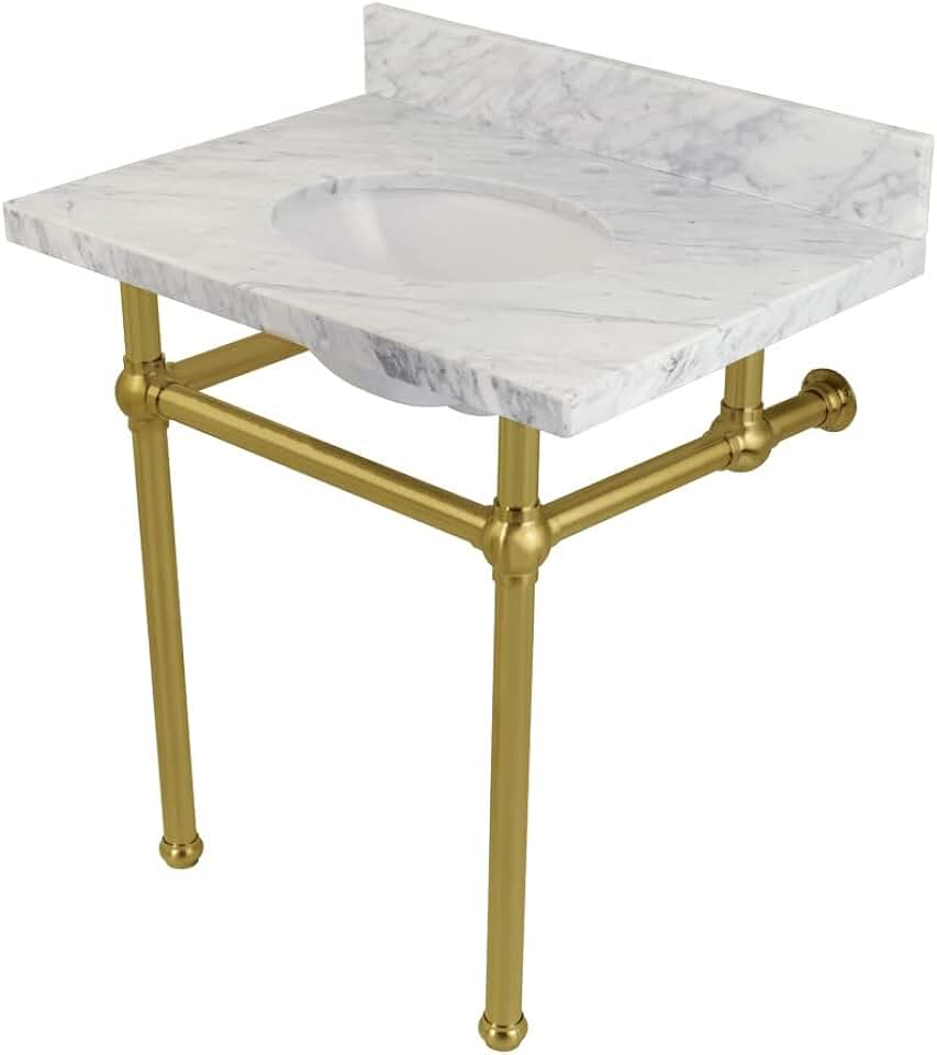 KVPB3030MB7 Templeton Carrara Marble Bathroom Console Vanity with Brass Pedestal, Carrara Marble/Brushed Brass