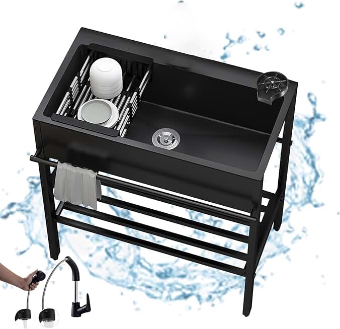 Black Laundry Room Sink,Commercial Kitchen Sink,Stainless Steel Stand Alone Sink,Set with Drain Basket & Hot and Cold Tap,Adjustable Leg Height,for Restaurant,Room. (Size : Stretched)