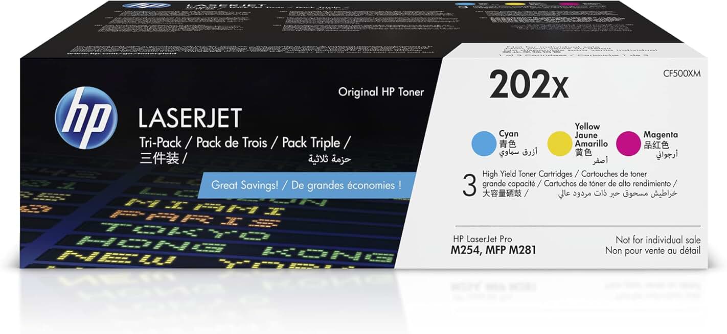 HP 202X Cyan, Magenta, Yellow High-yield Toner Cartridges (3-pack) | Works with HP Color LaserJet Pro M254, HP Color LaserJet Pro MFP M281 Series | CF500XM