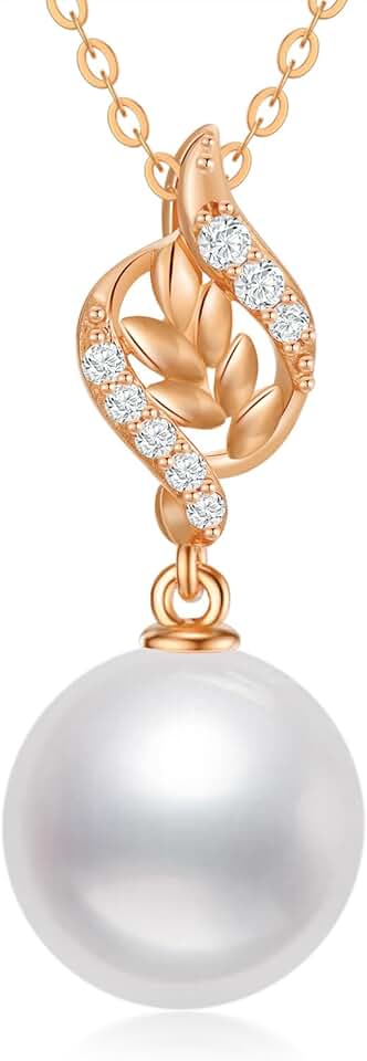 SISGEM 14k Rose Gold Diamond Leaves Pearl Necklace for Women, (0.1ct Natural Diamond, 9mm Freshwater Cultured Pearl), 16-18 Inches