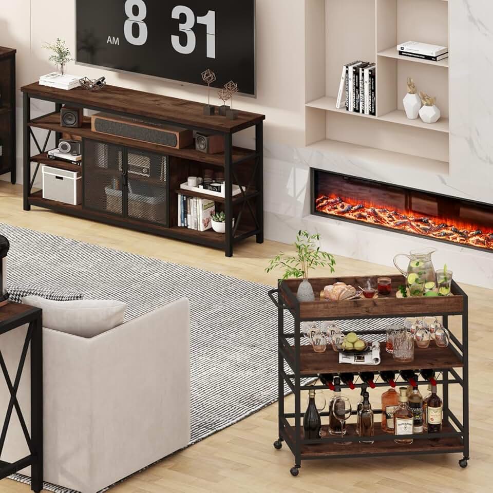 BON AUGURE Bar Cart for The Home, Rolling Home Bar Serving Cart on Wheels, Tall TV Stand for TVs up to 65 Inch, Industrial Wood Entertainment Center (32 Inch High, Rustic Oak)