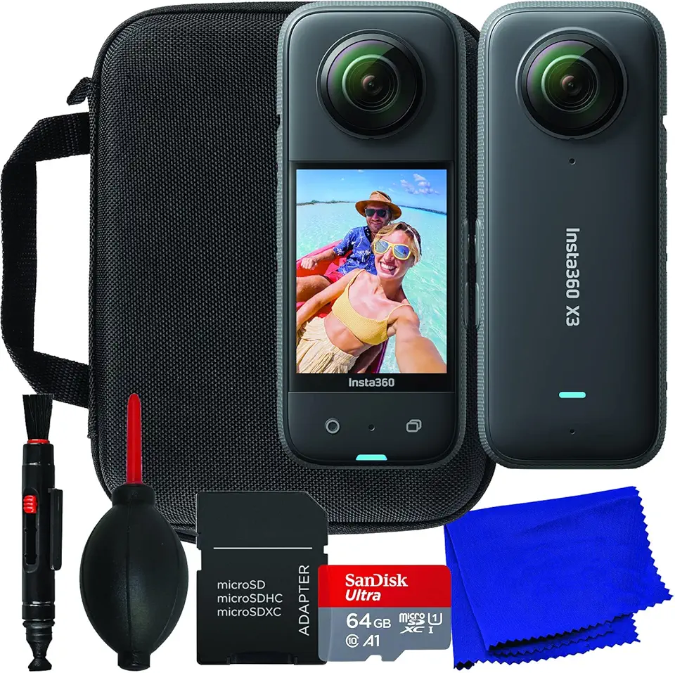 Ultimaxx Insta360 ONE X3 Basic Bundle + SanDisk 64GB Ultra Micro SDXC Memory Card, Water-Resistant Action Camera Case with Pre-Cut Foam Inserts, Manufacturer Accessories & More (10pc Bundle)