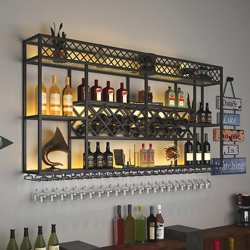 Industrial Iron Wine Shelf with Wine Glass Holder Bar Shelves Wall Mounted with LED Light Modern Bar Floating Bar Shelves Multifunctional bar Bottle Display Shelf for Kitchen Bar Decoration