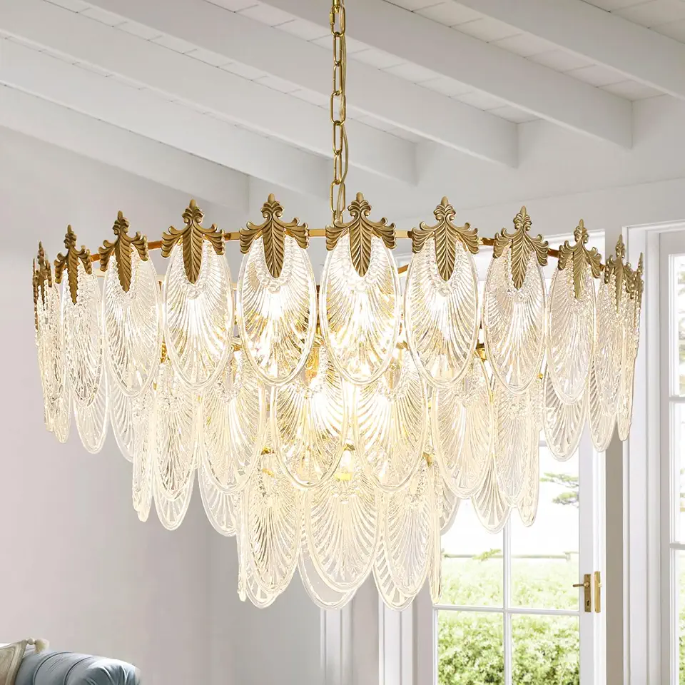 31" Modern Luxury Crystal Chandeliers, 12-Light Vintage Gold Pendant Light Fixture with 3-Tier Leaf Crystal Glass Lampshade for Living Room Kitchen, Included E12 LED Bulbs UL Listed