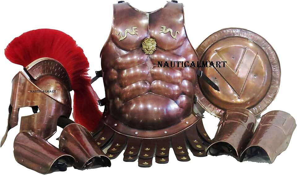 NauticalMart Medieval King Spartan Copper 300 Helmet W/RED Plume Muscle Jacket Leg ARM Guards