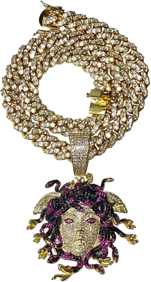 Medallion Medusa Iced Miami Cuban Chain Necklace Choker Chain 12mm 20 inches long, 14k Gold Finish Cuban Choker, Greek God Medusa Head Pendant, Medusa Charm, Iced Chain Pendant Necklace