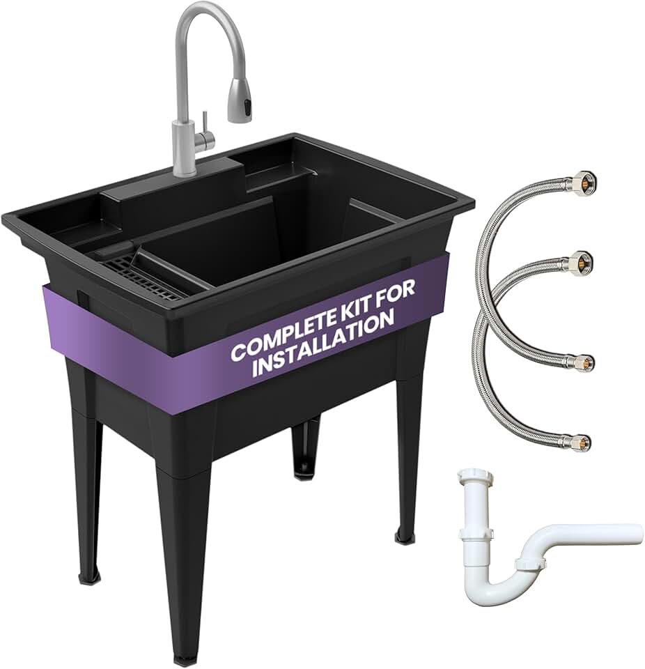 Standing Utility Sink with 1-Handle Pull-Down Gooseneck Faucet – 32” Utility Sinks for Laundry Room, Garage, Garden, Basement – Noah William Home Indoor and Outdoor Basement Wash Tub (Black)