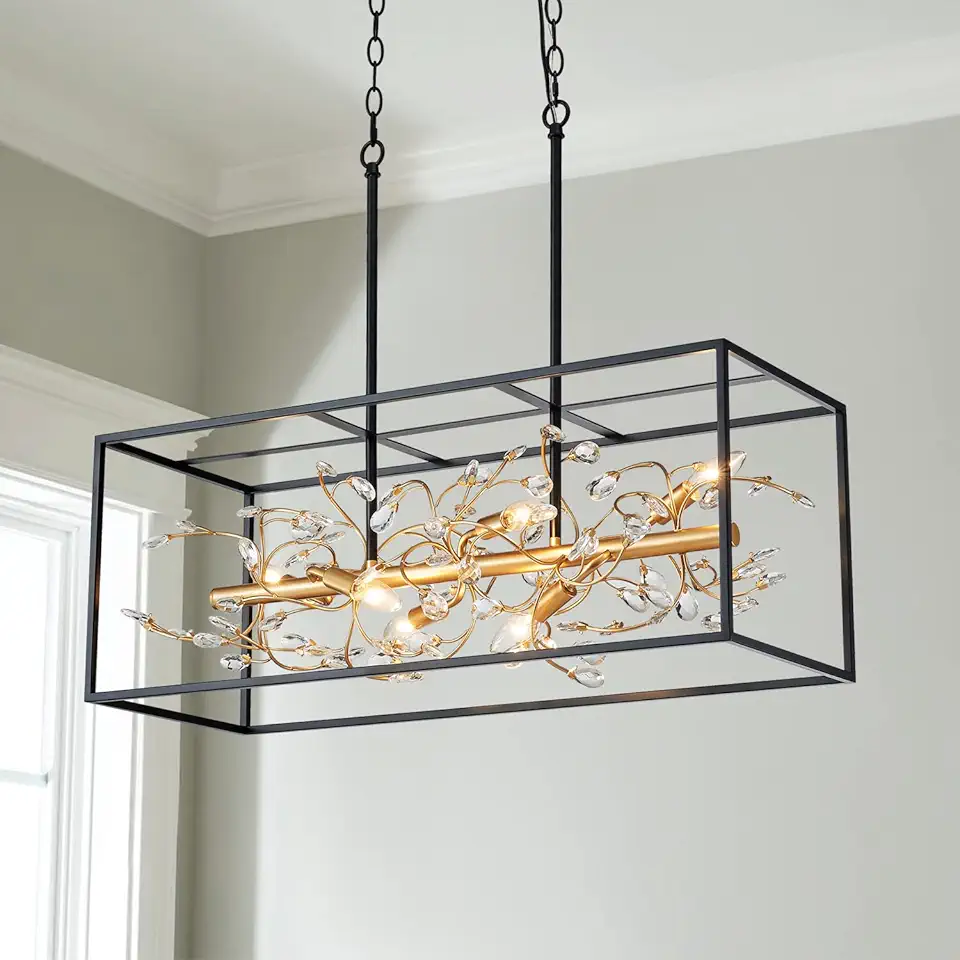 Saint Mossi Crystal Island Chandelier, Modern Rectangle Pedant Light Fixture for Living Space, L31 x W12 x H27, Adjustable Chains 59", Matte Black Metal Frame & Gold Finish Metal Branch