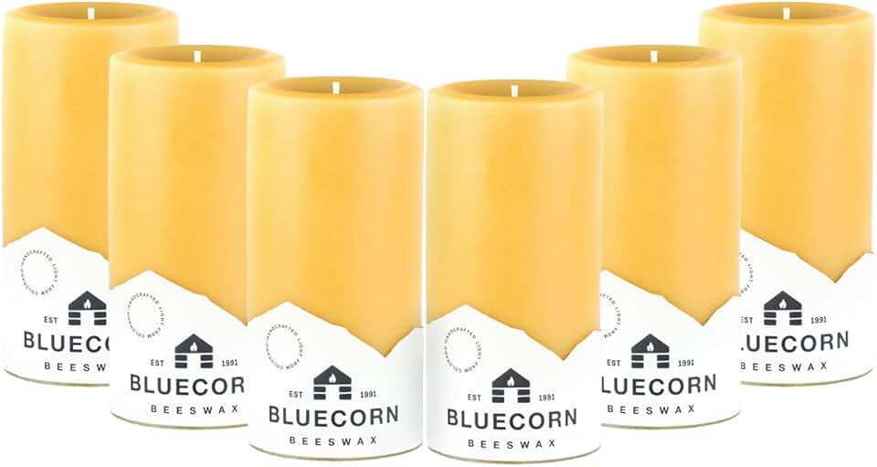 Bluecorn Beeswax 100% Pure Beeswax Pillar Candles | Natural Beeswax Candles, Unscented Yellow Candles | Soy, Paraffin, & Fragrance Free | 4x8, 240 Hour Burn Time, Bulk 6-Pack | Handmade in Colorado