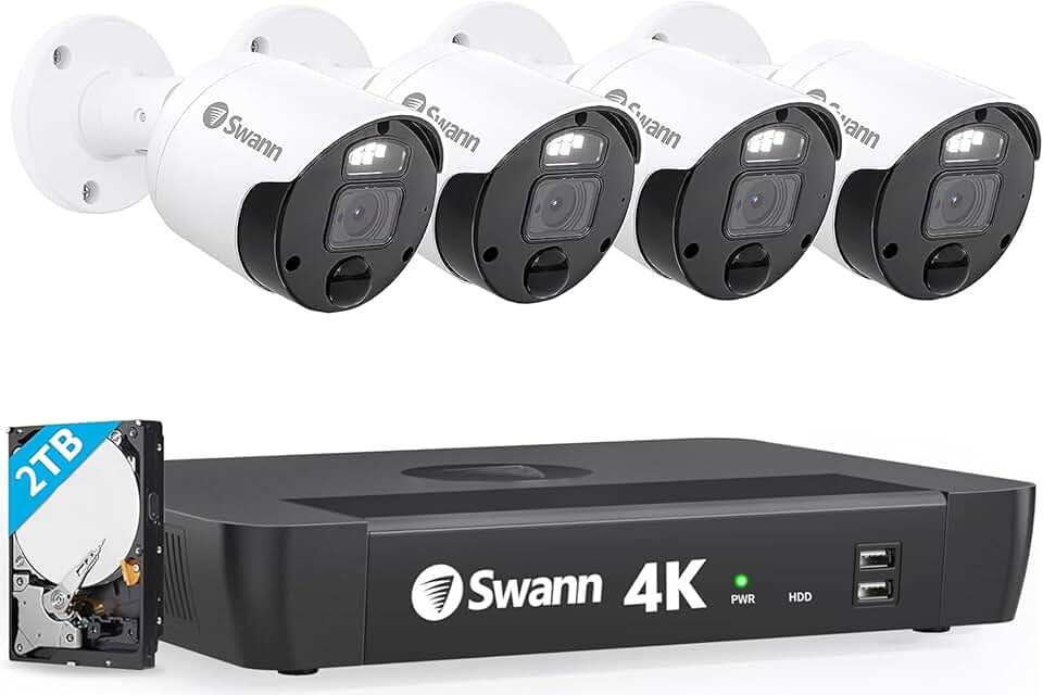 SWANN Master 4K 8 Channel Home Security Camera System, 2TB NVR, 4 PoE IP Cameras Outdoor, 8MP Wired Surveillance CCTV, Heat Motion Vehicle Detection, LED Light, 24/7 Recording Security Camera, 876804