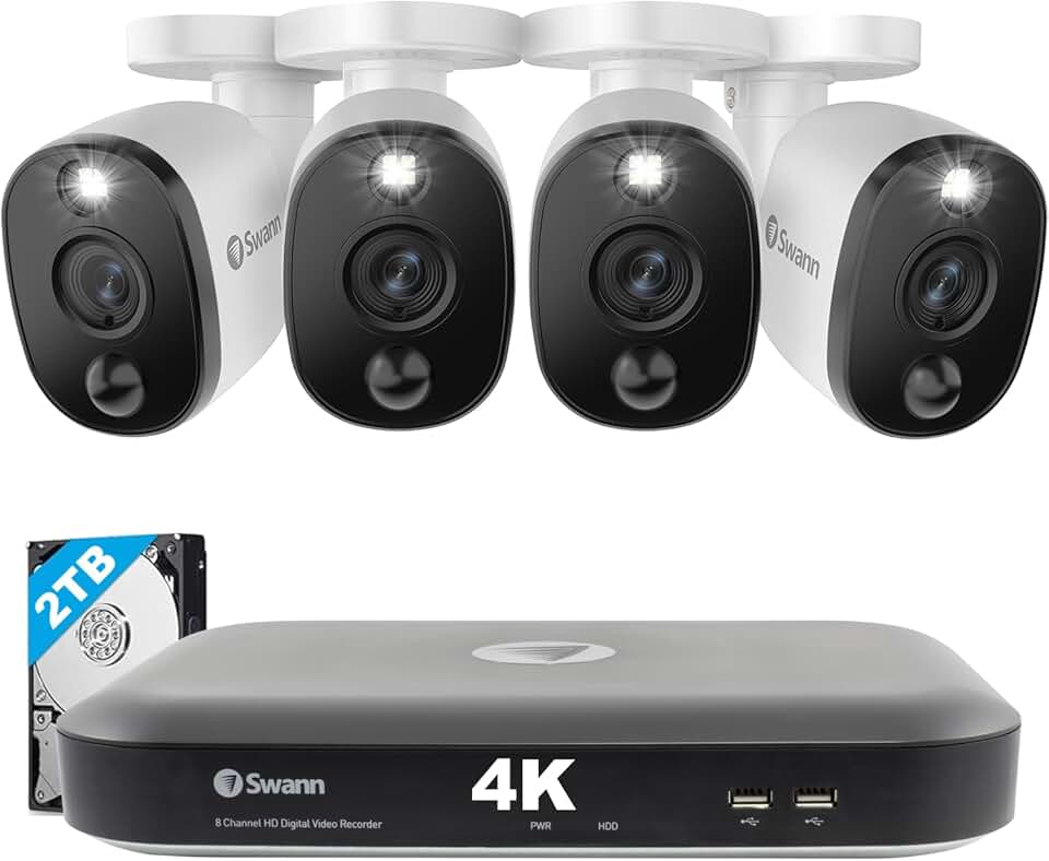 Swann Home Security Camera System with 2TB HDD, 8 Channel 4 Cam, 4K Ultra HD DVR, Indoor/Outdoor Wired Surveillance CCTV, Color Night Vision, Heat/Motion Warning Light, Alexa + Google, SWDVK-855804WL